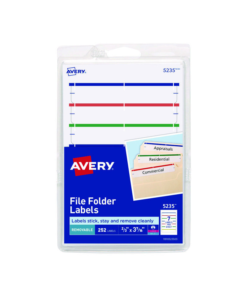 Labels stick and stay but remove cleanly when you have to make changes and revisions. Adhere to smooth surfaces including paper, cardboard, plastic, wood, glass, metal and more. Choose from white or colored labels that feature an eye-catching color strip at the top to make it easier to find just the folder you're looking for. The assorted colors make them great for color coding too. Easy to customize with free templates and designs from Avery® Design & Print. For laser and inkjet printers.