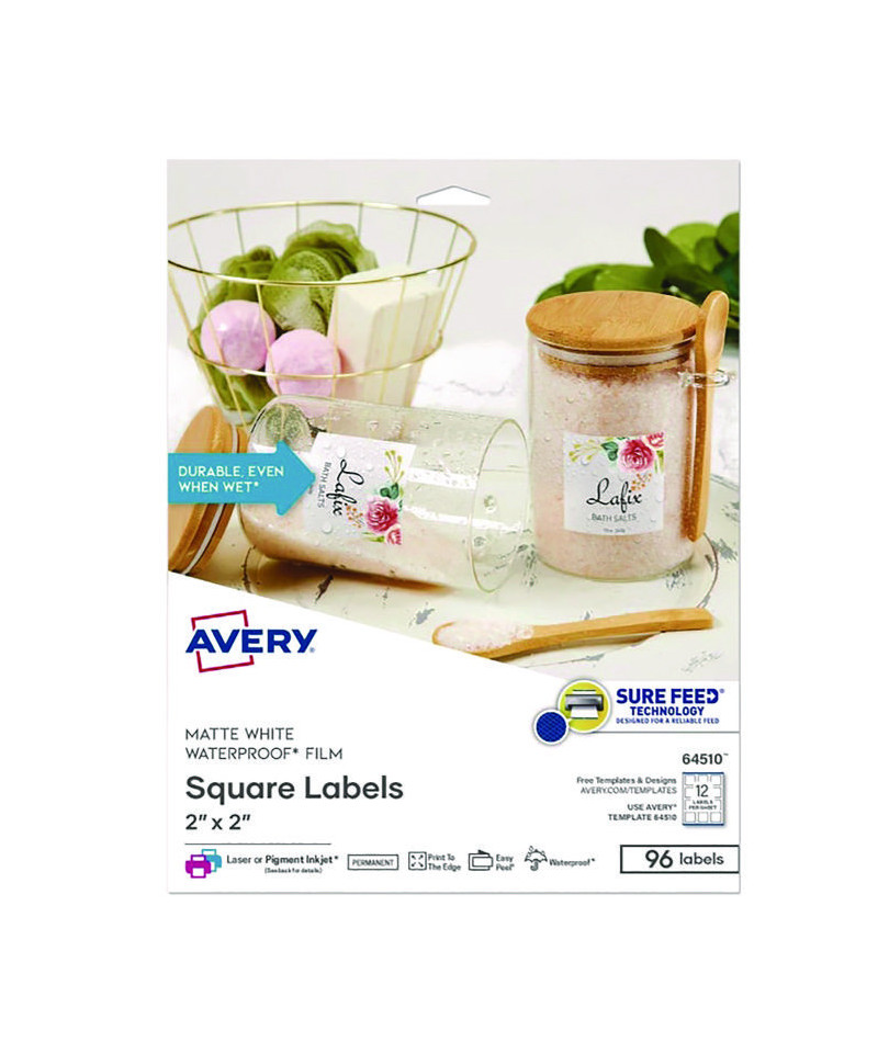 Whether you're running your own daycare, catering business or selling products, Avery 64510 Durable Waterproof Labels are the best choice for creating quality labels that last. Our water and oil proof labels are created with high-grade polyester film and a strong permanent adhesive that will keep your labels secure. Create your own essential oil labels, CBD labels, bath & beauty labels, candle labels, beverage labels and more with hundreds of customizable Avery templates. Sure Feed technology reduces jams or smudges by creating a more reliable feed through your printer.The patented Easy Peel label design makes these labels easy to peel and quick to apply. Just bend the label sheet, peel off your labels and fold the sheet back flat. The permanent adhesive ensures that your labels stick and stay without curling, peeling or falling off. Please Note: Waterproof when used with laser or pigment-based inkjet printers. Ink from traditional dye-based inkjet printers may smear when wet or exposed to moisture.