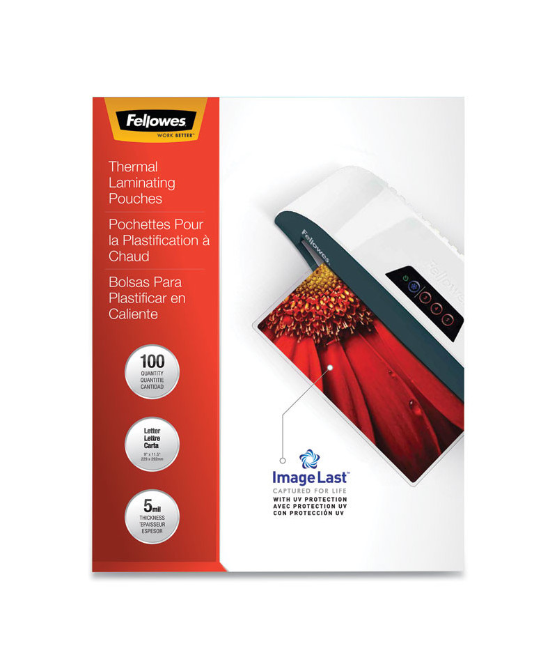 Premium ImageLast Laminating Pouches are designed with high-quality photo safe materials providing excellent clarity and durability. Featuring built in UV protection to prevent fading and unique directional arrows for accurate pouch insertion and Jam Free performance when used with a Fellowes laminator. Compatible with all thermal laminator brands. Use in the office, home office, school, or anywhere you would like to keep important papers preserved for years to come.