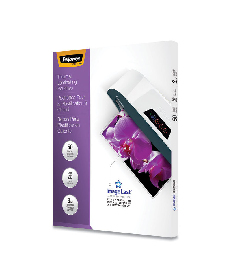 Premium ImageLast Laminating Pouches are designed with high-quality photo safe materials providing excellent clarity and durability. Featuring built in UV protection to prevent fading and unique directional arrows for accurate pouch insertion and Jam Free performance when used with a Fellowes laminator. Compatible with all thermal laminator brands. Use in the office, home office, school, or anywhere you would like to keep important papers preserved for years to come.