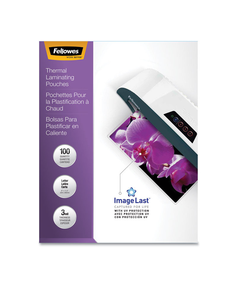 Premium ImageLast Laminating Pouches are designed with high-quality photo safe materials providing excellent clarity and durability. Featuring built in UV protection to prevent fading and unique directional arrows for accurate pouch insertion and Jam Free performance when used with a Fellowes laminator. Compatible with all thermal laminator brands. Use in the office, home office, school, or anywhere you would like to keep important papers preserved for years to come.