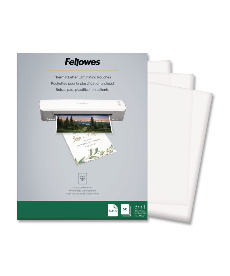 Fellowes thermal laminating pouches are designed with quality photo safe materials providing excellent clarity and durability to preserve and protect important documents. These pouches are dry erase friendly and compatible with all thermal laminator brands. Perfect to use in the office, home office, school, or wherever you have lamination needs. Keeps your important paper protected and looking very professional. Look for other laminating products from Fellowes.