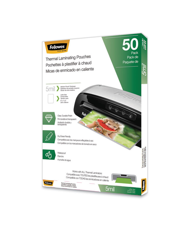 Fellowes thermal laminating pouches are designed with quality photo safe materials providing excellent clarity and durability to preserve and protect important documents. These pouches are dry erase friendly and compatible with all thermal laminator brands. Perfect to use in the office, home office, school, or wherever you have lamination needs. Keeps your important paper protected and looking very professional. Look for other laminating products from Fellowes.