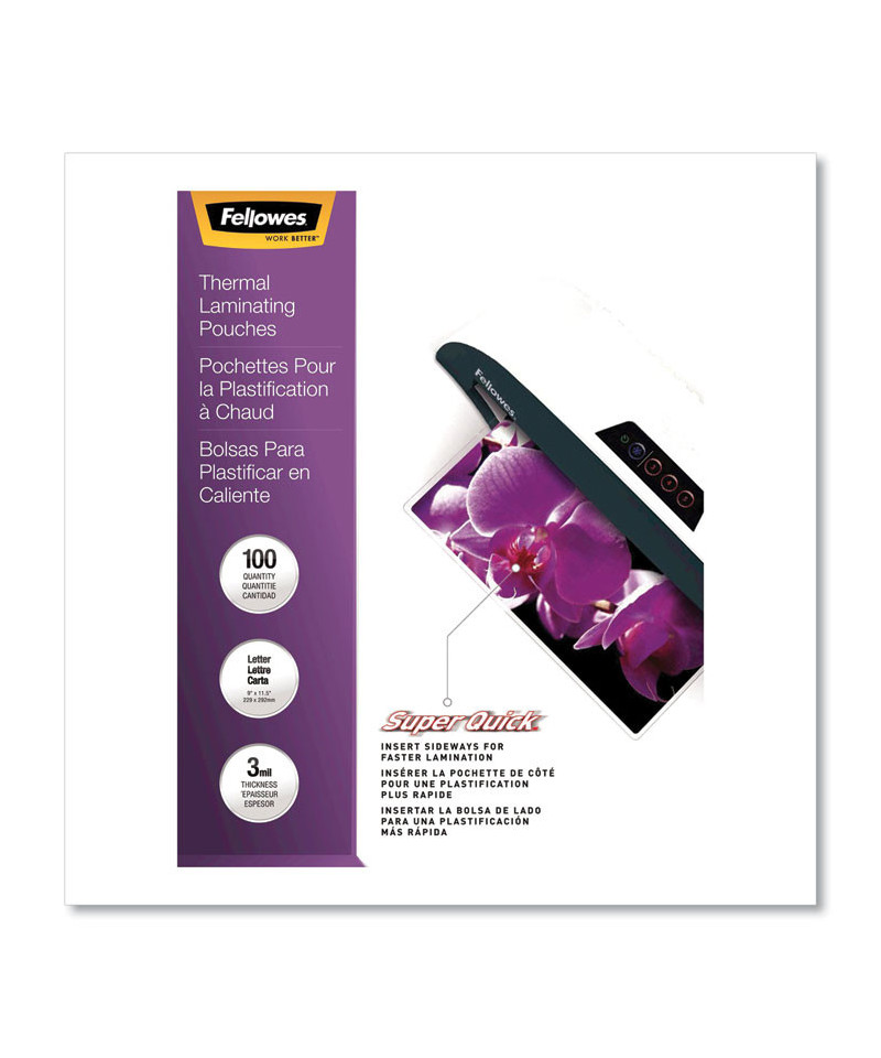 Fellowes Super Quick Thermal Laminating Pouches protect precious memories and important papers, while giving frequently referenced documents added durability. High transparency ensures professional results. Side-insert design delivers faster lamination performance. Works with any thermal laminating machine. Perfect for use in the office, home offices, school, or wherever you need to protect important papers and materials. Laminate pictures, papers, artwork or anything you want to cherish.