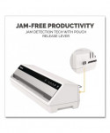Designed for small office applications. Warms up in one minute with InstaHeat Technology. Compatible with 3- and 5-mil hot-lamination pouches as well as cold-lamination pouches. Release lever disengages pouch for re-centering or removal. Auto Shut-Off prevents overheating when not in use. Includes laminating starter pack.