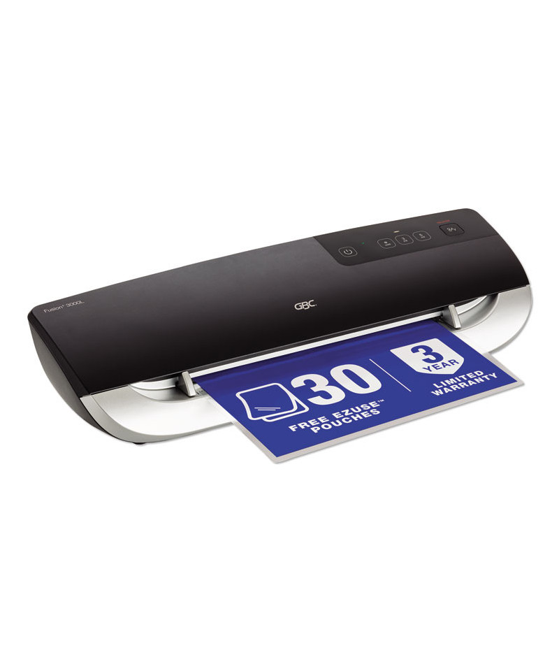 Super easy for anyone to use, the Fusion™ 3000L Laminator delivers high quality results. A perfect laminating machine for office use. Start laminating in just one minute! The 3000L warms up in just 60 seconds and offers a 19 inches per minute laminating speed. Ideal for offices and users who laminate on a regular basis. Touch controls allow you to easily choose between 3 and 5 mil pouch thickness. A cold setting is available to produce smooth results when used with pressure sensitive pouches. Additional features include a green visual alert and an audible beep to indicate that the machine has finished warming up and is ready for use. Intelligent Jam Alert technology is also included; the laminator automatically detects a jammed or misfed pouch and beeps until the release button is pressed and the pouch is removed. Intelligent Power Off shuts down the machine after 30 minutes of inactivity.