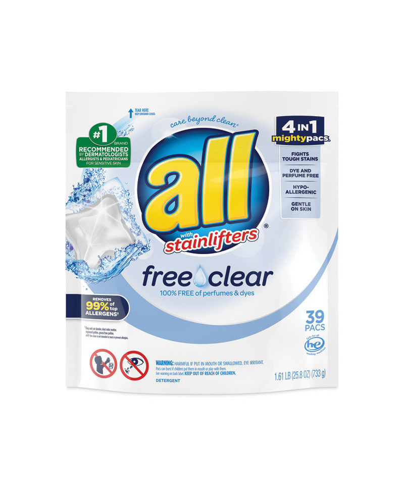 all® free clear Mighty Pacs® are 100% free of perfumes and dyes with concentrated cleaning power in a convenient pac. all® free clear is the #1 recommended detergent brand by dermatologists, allergists and pediatricians for sensitive skin. These hypoallergenic Mighty Pacs are Tough on Stains, Gentle on Skin. all® free and clear Mighty Pacs® are unscented, fragrance free, and are safe to use in any washing machine including high efficiency (HE) and they dissolve completely even in cold water. Add pac to washing machine drum before adding clothes. Use one pac for small and medium loads or two pacs for larger loads then wash as usual. all® Mighty Pacs are safe for septic systems and contain no phosphates.