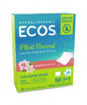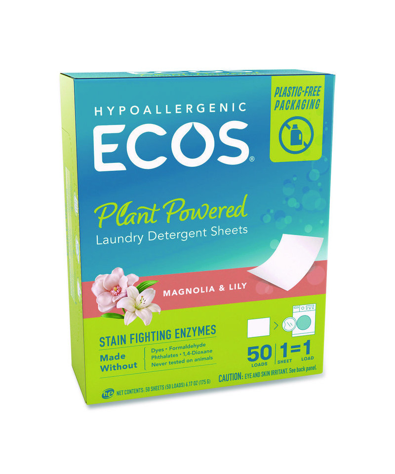 A solid new way to do your laundry. Designed for both homes and businesses, these ECOS® liquidless laundry detergent sheets offer a plastic-free, lightweight, mess-free alternative that makes sustainable living a breeze. Our laundry detergent fights tough stains and odors with plant-powered cleaners and enzymes packed into every sheet. Say goodbye to sticky spills and hoisting heavy jugs, and elevate your laundry experience with ECOS® the sustainable, convenient, and highly effective solution you've been searching for! 100% plastic free packaging reduces plastic waste, contributing to a sustainable future for both homes and businesses. Not tested on animals.