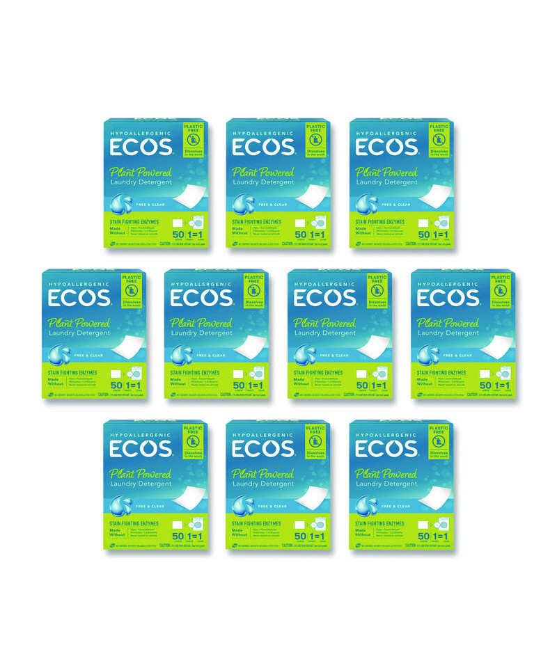 A solid new way to do your laundry. Designed for both homes and businesses, these ECOS® liquidless laundry detergent sheets offer a plastic-free, lightweight, mess-free alternative that makes sustainable living a breeze. Our laundry detergent fights tough stains and odors with plant-powered cleaners and enzymes packed into every sheet. Say goodbye to sticky spills and hoisting heavy jugs, and elevate your laundry experience with ECOS® the sustainable, convenient, and highly effective solution you've been searching for! 100% plastic free packaging reduces plastic waste, contributing to a sustainable future for both homes and businesses. Not tested on animals.