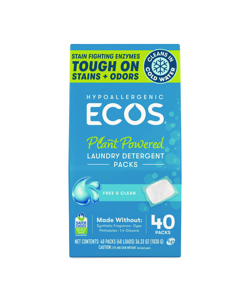 Redefining convenience, these sustainable, all-in-one laundry packs make washing a breeze. Our advanced, plant-powered formula harnesses the natural cleaning power of enzymes, which penetrate deep into fabric fibers to break down and eliminate stubborn stains, ensuring a thorough and effective clean with every wash. Say goodbye to sticky spills and hoisting heavy jugs, and elevate your laundry experience with ECOS the sustainable, convenient, and highly effective solution you've been searching for! Works well with all washing machines, temperatures, and cycles. 100% plastic free packaging reduces plastic waste, contributing to a sustainable future. Not tested on animals. Manufactured in a facility that is LEED Zero Carbon, LEED Zero Waste, and LEED Zero Energy Certified.