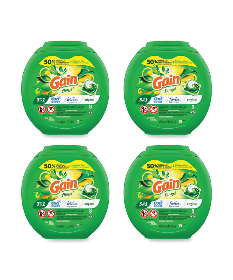 Easy-to-use Gain® flings provide a unit-dose of laundry detergent with 50% more* Gain® Original scent to your clothes. A pleasant scent combines with Oxi boost to fight stains while Febreze® eliminates unpleasant odors. Complete detergent leaves clothes left wonderfully clean with an amazing scent. Designed for Standard and HE machines.