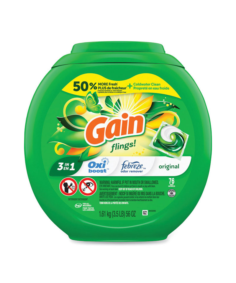 Easy-to-use Gain® flings provide a unit-dose of laundry detergent with 50% more* Gain® Original scent to your clothes. A pleasant scent combines with Oxi boost to fight stains while Febreze® eliminates unpleasant odors. Complete detergent leaves clothes left wonderfully clean with an amazing scent. Designed for Standard and HE machines.