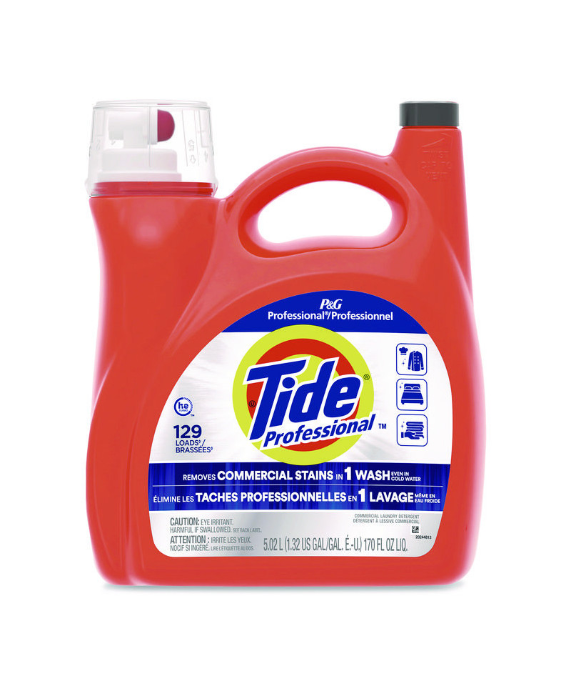 America's #1 Laundry Detergent - Now Formulated for Professionals. This Commercial Liquid Laundry Detergent is designed for businesses with high volume laundry washing needs, removing commercial stains in 1 one wash. Tide® PRO Commercial Liquid Laundry Detergent helps remove tough stains like food grease, hair and make-up products, coffee and more! Ideal for lodging, salon and spas, care homes and more. Tide® PRO is suitable for both commercial and residential washing machines. This is a bulk size detergent good for 129 loads.