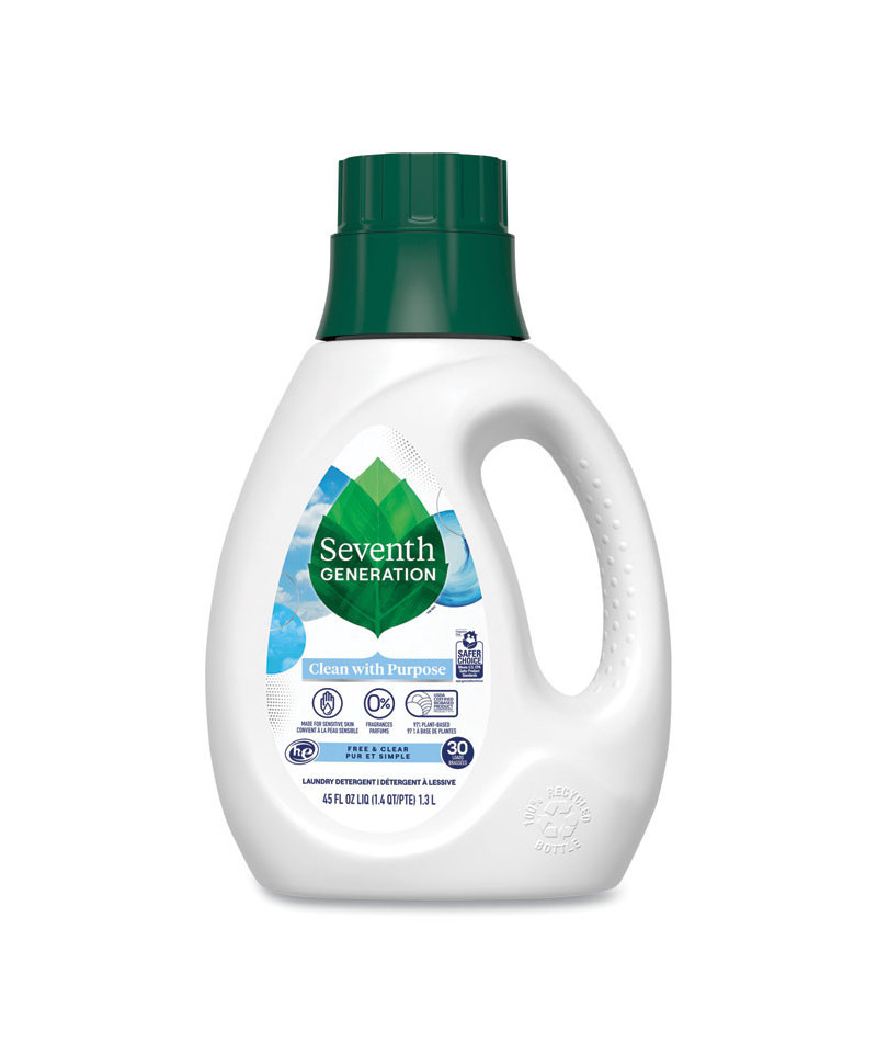 Hang wash-day worries out to dry! Unique formula contains plant-derived cleaning agents and triple enzymes to make short work of even tough stains, but is gentle. Powers through tough wash day challenges without dyes, optical brighteners or synthetic fragrances. Clinically tested hypoallergenic and non-irritating to skin. Designed for standard and HE machines, and works well in all temperatures. For more than 25 years, Seventh Generation has been thoughtfully formulating safe and effective plant-based products that work. Really well. You may also notice a cute Leaping Bunny seal on our products. That means we never test our products on animals and our products do not contain animal-based ingredients. Based in Vermont, Seventh Generation is proud to be a Certified B Corporation.