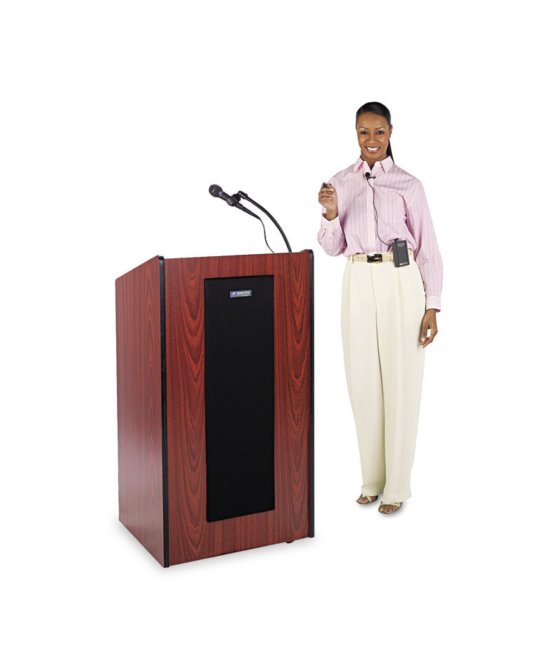 Powerful design for boardroom, meeting room or auditorium. Two large storage shelves provide a place for laptop, binders and notes. Easily mobile on four hidden casters (two locking). Includes two 6 x 8 Jensen Design Speakers.