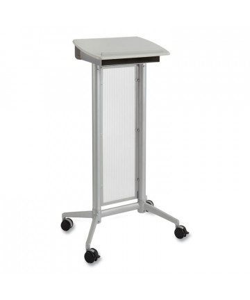 Sturdy 3/4" wood construction with stain-resistant laminate finish. Slanted reading surface with pencil tray and cushioned wrist support/paper stop. Side shelf pulls out on left or right to hold equipment or notes. Two curved interior shelves allow speaker to stand close to the lectern. Smoothly mobile on four swivel casters (two locking). Easy assembly with cam-lock fasteners.