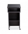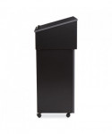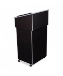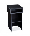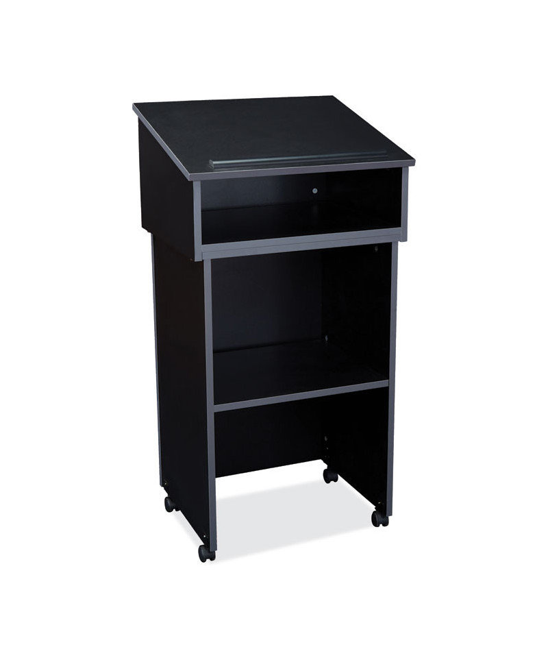 The versatile combo 22/112 mobile full floor lectern from Oklahoma Sound® features stain- and scratch-resistant thermofused melamine laminate secured to a strong particleboard core. It is ideal for supporting presentation equipment like projectors. The sturdy cabinetry Includes a shelf with ample storage space and four easy-roll casters (two locking). Modern two-tone black and charcoal design enhances any setting.