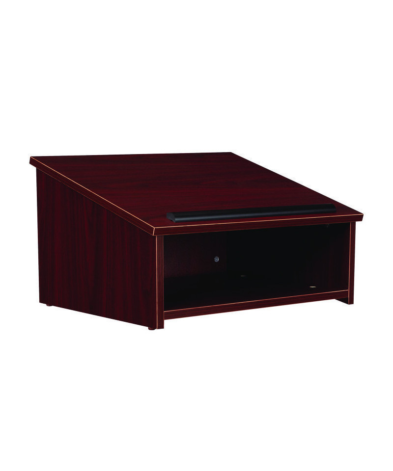 The versatile #22 Tabletop lectern functions great on its own or in conjunction with the #112 floor lectern base (sold separately). Its 0.75" thick structure is comprised of stain and scratch-resistant thermofused melamine laminate secured to a particleboard core. The #22 also features a convenient paper/book stop below its ample reading surface.