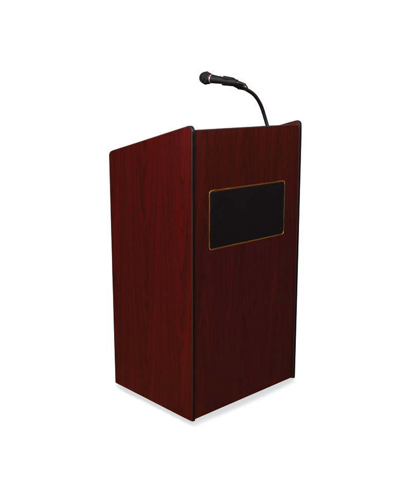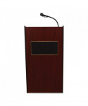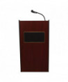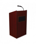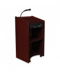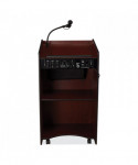 The Model #6010 Aristocrat is an illustrious, executive-style sound lectern of fine and spacious cabinetry adorned with gold-colored trimming. Its 50 W amplifier with two built-in 8 speakers is just right for venues like large conference rooms and auditoriums that hold an audience of around 2,500. Multimedia capabilities include simultaneous usage with two wired and one wireless (optional) microphones. This sound lectern comes complete with a handheld mic with 9 ft cable and a tie-clip/lapel mic with 10 ft cable. It operates either by AC plug or with optional battery model PS12-V and features input jacks for CD players, extension speakers, recording outputs and playing MP3s. Includes a surface-mounted digital timepiece for monitoring speech duration and four concealed easy-roll casters (two locking) for smooth mobility.