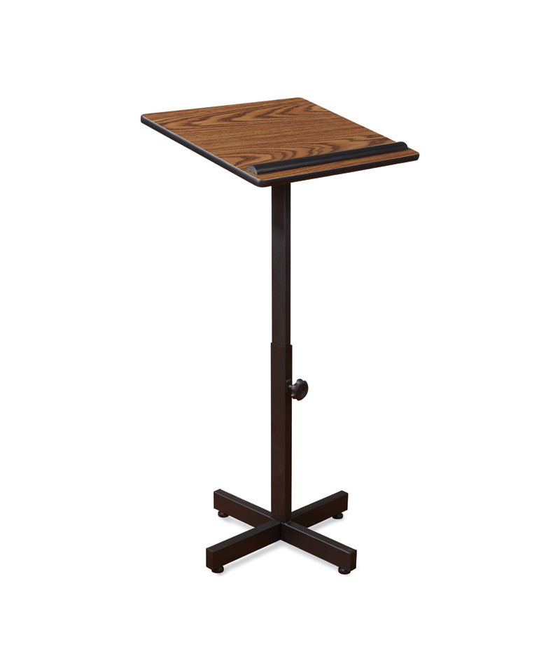 The #70 Lectern Stand is a reliable and inexpensive option with a practical application in virtually any public speaking venue. It features a black 16-gauge steel base which adjusts from 30 to 44 high to suit any speaker's stature. A generous 16 x 20 reading surface for presentation materials features protective T-mold edging and a helpful paper/book stop.
