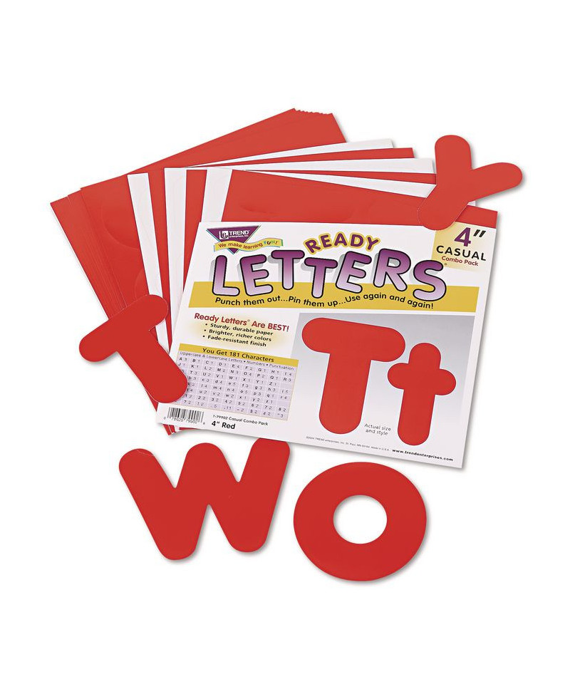 Time-savings and easy to use—simply punch out and pin up for attention-getting messages. Reusable and fade-resistant finish. Bright colors enhance any display and coordinate with all TREND® products. Perfect for classroom and office displays. Set contains 50 uppercase letters, 82 lowercase letters, 20 numerals 0-9, 29 punctuation marks and one blank sheet.
