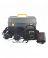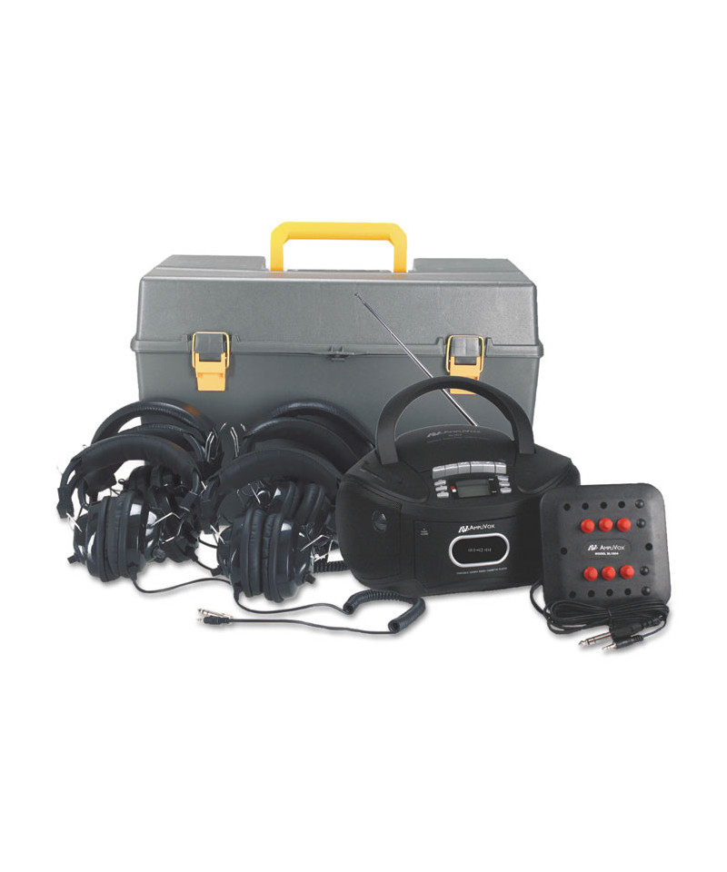 Features a stereo six-station jack box with volume control for each station. It includes six stereo/mono headphones with volume control for each ear, soft leatherette ear cushions and padded headband covers. Top loading CD player has an AM/FM stereo tuner and LED display. The full auto-stop cassette recorder records from CD and radio.