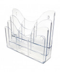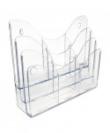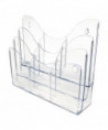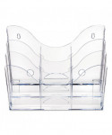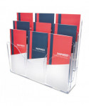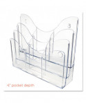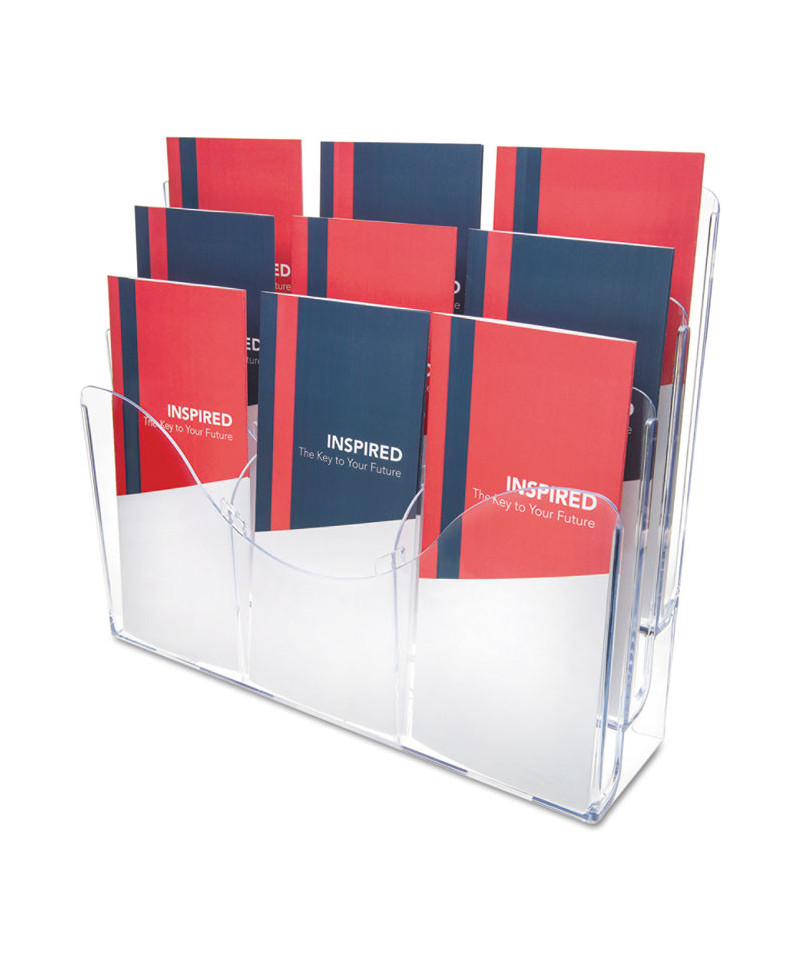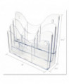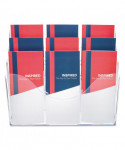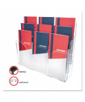 Patented configurable display can hold a combination of magazine and leaflet/pamphlet size literature. Also accommodates letter, legal and A4 documents. Each pocket holds up to 1" capacity. Ribs at the bottom eliminate drooping. Organizer lies flat or stands upright on desktop/counter to conserve space. Also wall mountable. Includes six removable dividers to create up to nine compartments.
