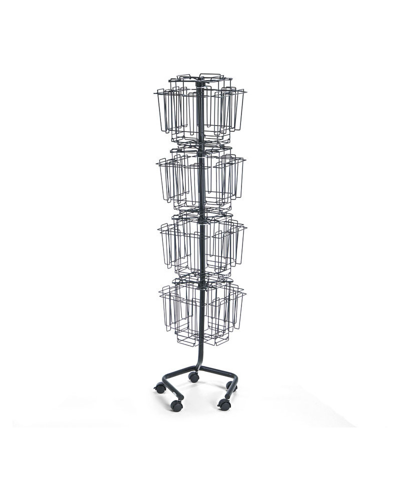 Clean, open-wire look allows for a full-front view of literature. Layers rotate independently for easy literature selection. Five dual-wheel casters (two locking). Disassembles and reassembles quickly, ideal for trade shows. Welded wire construction with a powder coated finish.