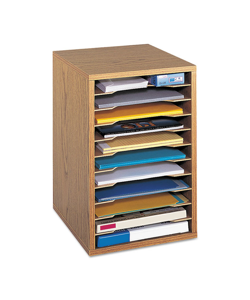 Compact sorter with removable shelves only during assembly so you can customize the compartments. Ten hardboard shelves form up to eleven 9 1/2w x 11 5/8d x 1 1/4h letter-size compartments and support up to 15 lbs. each. Made of 1/2" compressed wood with laminate finish; solid fiberboard back.