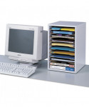 Vertical desktop sorter is compact for maximum desktop organization. Shelves are removable only during assembly so you can customize the compartments. Ten hardboard shelves form up to eleven 9 1/2w x 11 5/8d x 1 1/4h letter-size compartments and support up to 15 lbs. each. Made of 1/2" compressed wood with laminate finish; solid fiberboard back.