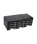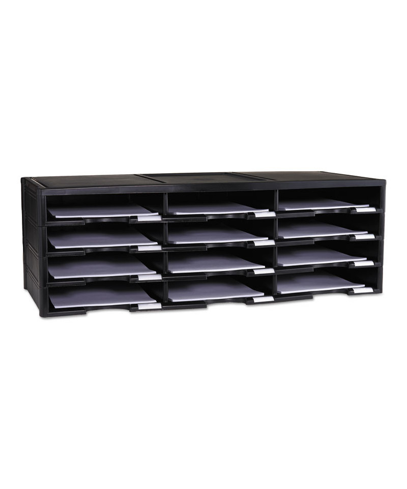 This organizer is made entirely of recycled plastic. Letter size documents or literature can be stored in one of the 12 9" x 12" x 2" compartments. Each compartment features a convenient label holder to easily identify its contents. Holds over 60 lbs. Simple assembly requires no tools. Can be stacked up to 72 compartments high.