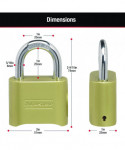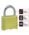 Durability and simplicity are the dominating characteristics in the design of this padlock. The brass with hardened steel shackle ensures a tough, durable lock. The resettable combination allows up to 10,000 possible settings. For convenience, simply use the change key to quickly reset the password and pass the lock onto another user.