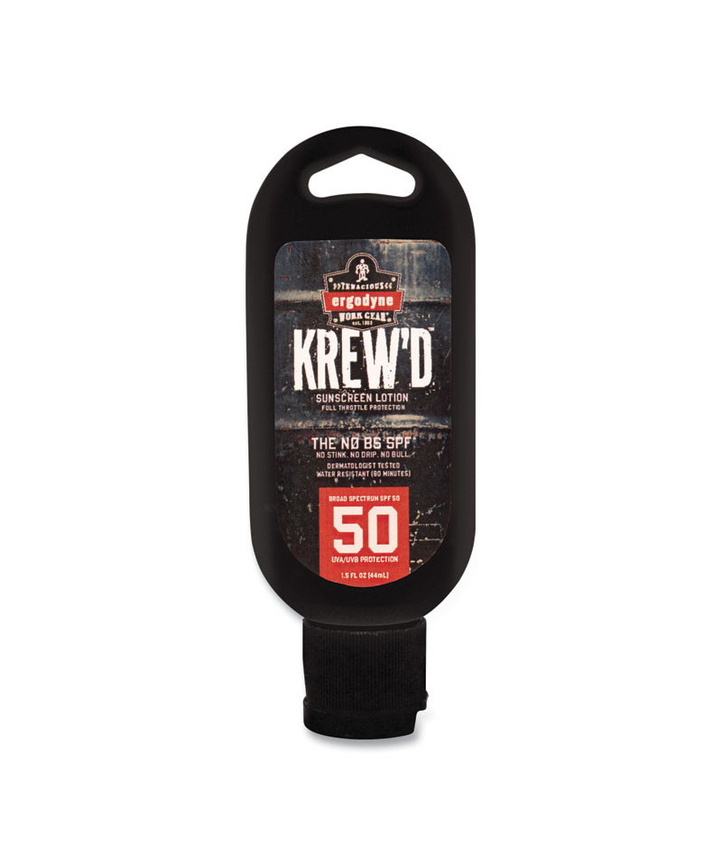 The Krewd 6352 SPF 50 Sunscreen Lotion provides safe and effective broad-spectrum UVA/UVB protection against sunburn. It's a water-resistant and sweat-resistant sunscreen that lasts for 80 minutes. This FDA-approved sunscreen comes in a 1.5 oz squeeze bottle with a connection point for an optional hang cord or carabiner to attach to belt loops, backpacks, keys, and more. The 50 SPF offers protection against both UVA and UVB rays, which can cause skin cancer. Sport formula provides even coverage for better protection. It's lightweight, non-greasy, absorbs quickly and is free of paraben/phthalates and octinoxate/oxybenzone. Slather. Work. Repeat. Skin damage can occur all year round from sun exposure. Sunblock should be applied evenly and thoroughly on exposed skin. We recommend applying liberally 15 minutes before you go into the sun to allow the sunscreen to fully bind to the skin. Reapply every two hours, or as needed.