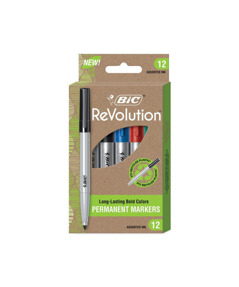 These long-lasting BIC ReVolution fine permanent markers have sleek gray barrels made in part of recycled plastic. The paperboard used in this packaging is made up of entirely recycled materials. The bold ink is perfect for any and all projects. It's fine, precision bullet nib is great for creating vivid marks on glass, metal, photos, plastic and much more. Even better, these markers won't dry out for two weeks if they're left uncapped. Get quality permanent markers you can trust.