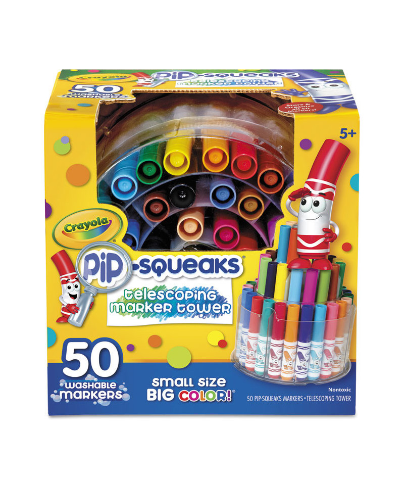 The Crayola Pip Squeaks Marker Tower boasts small size but big color! Little hands will love Pipsqueaks Markers for drawing, coloring, and creating one of a kind art projects! Doubling as both a display and storage case, this marker set lets you show off your drawing supplies to friends. Perfect for coloring books and crafts for kids, these washable markers won't bleed through the page.
