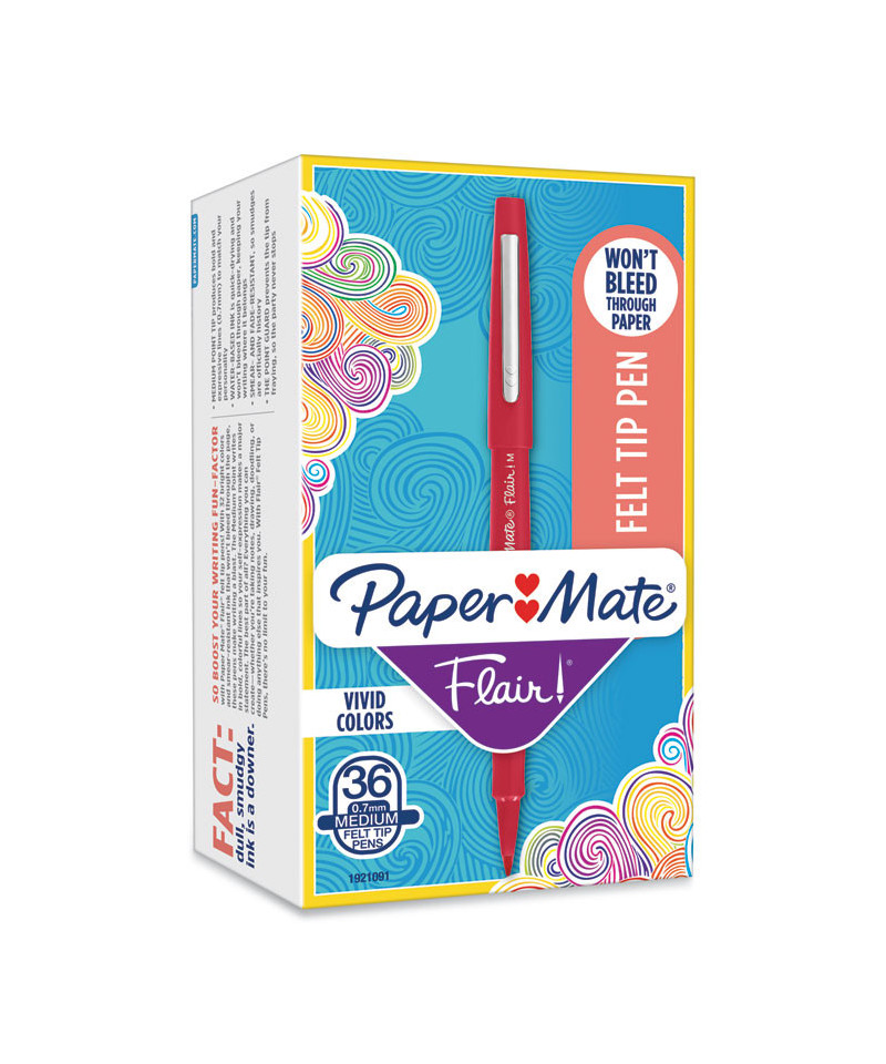 Add bright, vivid details to your writing and drawing with Paper Mate Flair Felt Tip Pens. Featuring a comfortable barrel grip and high-quality water-based inks, these pens are compatible with most surfaces and won't bleed through paper. These pens feature point guards that prevent the tips from fraying and drying out to keep your pen fresh. Every stroke produces bold, clean lines that are perfect for drawing, editing documents and checking papers.