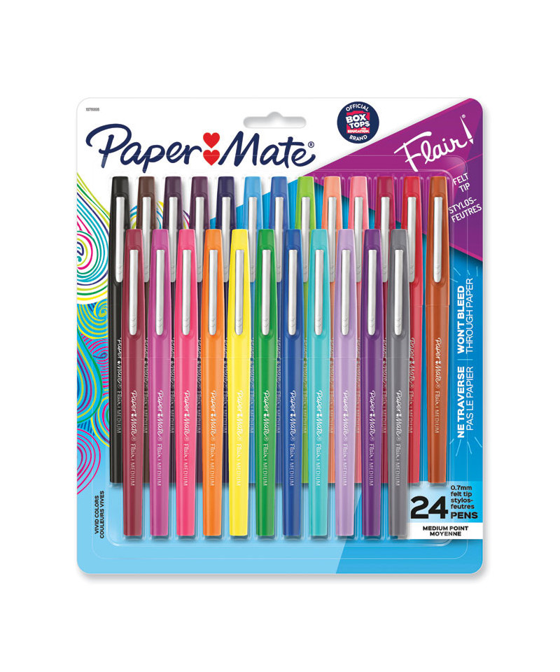 Add bright, vivid details to your writing and drawing with Paper Mate Flair Felt Tip Pens. Featuring a comfortable barrel grip and high-quality water-based inks, these pens are compatible with most surfaces and won't bleed through paper. These pens feature point guards that prevent the tips from fraying and drying out to keep your pen fresh. Every stroke produces bold, clean lines that are perfect for drawing, editing documents and checking papers.