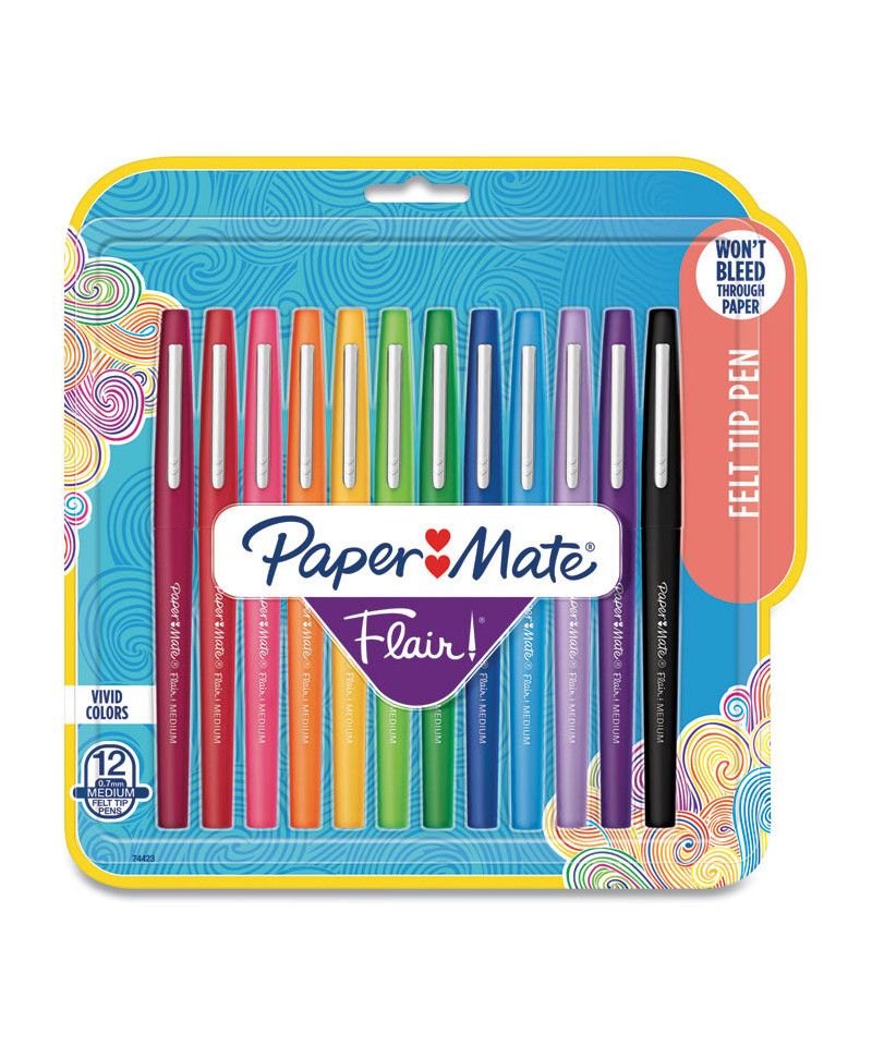 Add bright, vivid details to your writing and drawing with Paper Mate Flair Felt Tip Pens. Featuring a comfortable barrel grip and high-quality water-based inks, these pens are compatible with most surfaces and won't bleed through paper. These pens feature point guards that prevent the tips from fraying and drying out to keep your pen fresh. Every stroke produces bold, clean lines that are perfect for drawing, editing documents and checking papers.