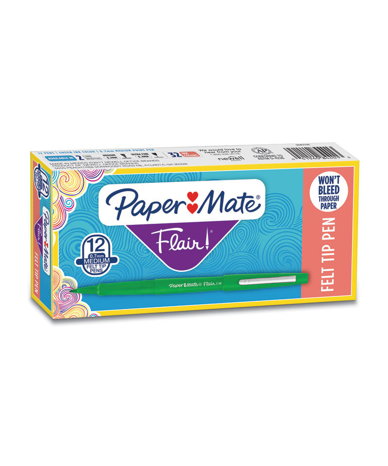 Add bright, vivid details to your writing and drawing with Paper Mate Flair Felt Tip Pens. Featuring a comfortable barrel grip and high-quality water-based inks, these pens are compatible with most surfaces and won't bleed through paper. These pens feature point guards that prevent the tips from fraying and drying out to keep your pen fresh. Every stroke produces bold, clean lines that are perfect for drawing, editing documents and checking papers.