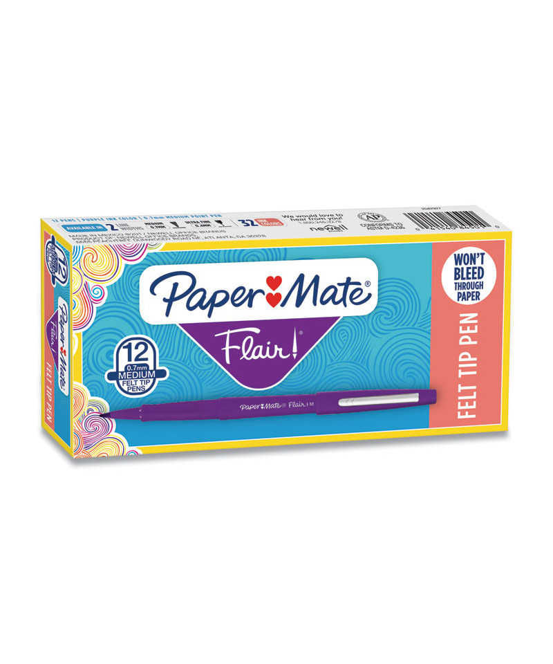 Add bright, vivid details to your writing and drawing with Paper Mate Flair Felt Tip Pens. Featuring a comfortable barrel grip and high-quality water-based inks, these pens are compatible with most surfaces and won't bleed through paper. These pens feature point guards that prevent the tips from fraying and drying out to keep your pen fresh. Every stroke produces bold, clean lines that are perfect for drawing, editing documents and checking papers.