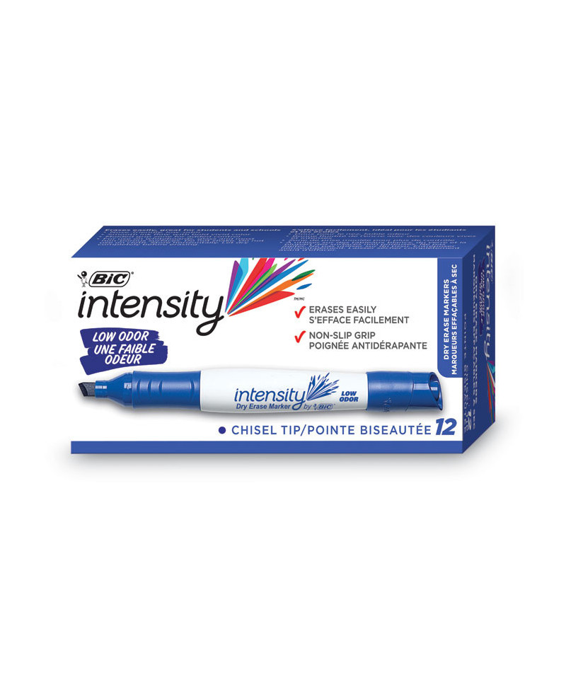 With a molded grip zone and versatile chisel tip, BIC Intensity Low Odor Dry Erase Markers are ideal for school, work and home projects. These ACMI-approved and non-toxic markers provide smooth ink flow and bright, low-odor ink and are suitable for use on dry erase boards, glass and most non-porous surfaces. The chisel tip makes bold, broad lines and the vivid marks easily erase with a cloth, tissue or felt eraser.