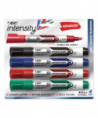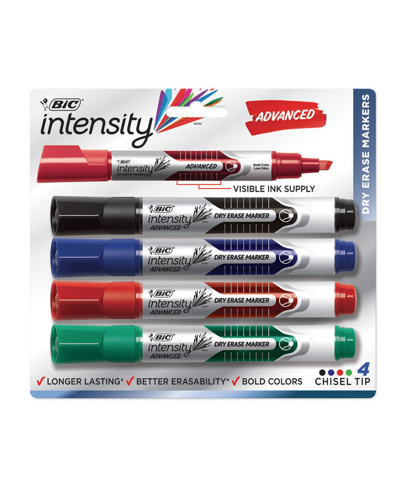 BIC Intensity Advanced Dry Erase Markers deliver both low odor and bold writing. With their long-lasting supply of liquid ink, these markers provide smooth, consistent ink flow on whiteboards, glass, and most non-porous surfaces. These markers also offer a visible ink supply, so you can easily check if you're running low. Marks erase easily with a tissue or cloth. Available in a variety of bright, vivid colors, these dry erase markers are a great choice for home, school, or the office.