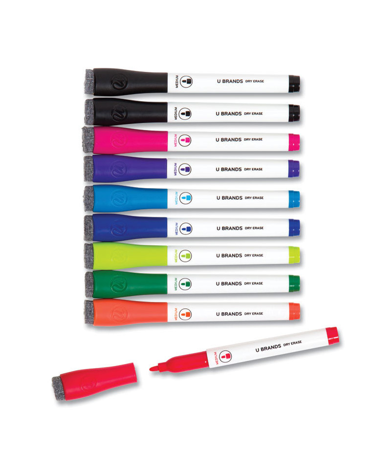 U Brands medium point dry erase markers feature bold and vibrant color inks that dry quickly, erase easily and work great on any dry erase board surface. The markers also feature long-lasting, non-toxic, low odor ink that is great in any classroom, home, office or commercial environment. The dry erase markers feature a medium tip for a precise writing experience on any melamine, painted steel, porcelain or glass dry erase surface. The contoured marker cap design prevents the markers from rolling off any flat surface or tray. The built-in felt eraser into the marker cap enables quick, convenient and precise erasing. For best results, re-cap the marker immediately after use and store horizontally.