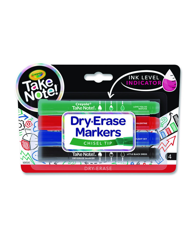 Crayola® Take Note Dry-Erase Markers are quick to dry but easy to erase! Vibrant colors are great for bold messages on most white boards. Each marker has a chisel tip that is perfect for thick or thin lines and features an ink level indicator so you always know when it's time to restock. The markers are low odor, making them ideal for classrooms, offices, and meeting rooms.