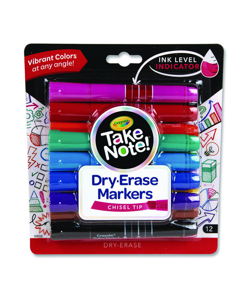 Crayola® Take Note Dry-Erase Markers are quick to dry but easy to erase! Vibrant colors are great for bold messages on most white boards. Each marker has a chisel tip that is perfect for thick or thin lines and features an ink level indicator so you always know when it's time to restock. The markers are low odor, making them ideal for classrooms, offices, and meeting rooms.