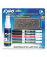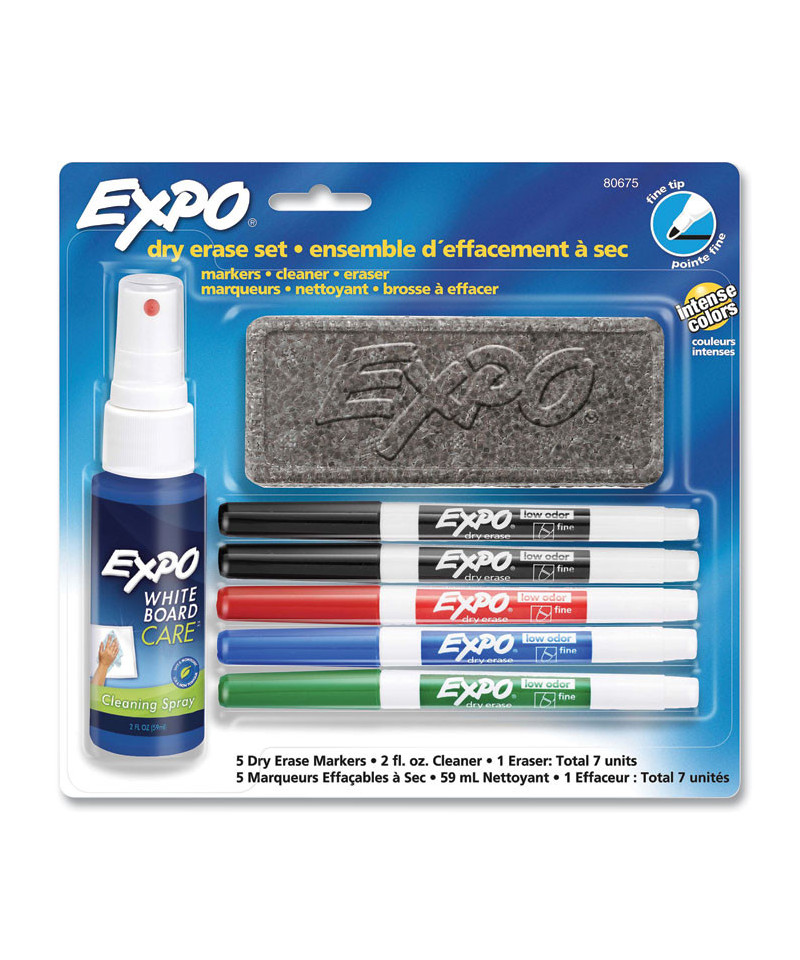 Great for meeting rooms, classrooms and when you're on the go. You get everything you need, all stored in a handy, durable case. Includes eight chisel tip bold color markers, four fine tip bold color markers, an EXPO® eraser and an 8-oz. bottle of EXPO® cleaner.