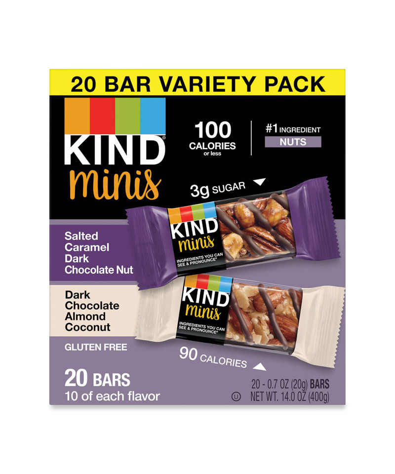 Enjoy a wholesome treat with the KIND Minis Dark Chocolate Nuts & Sea Salt, Peanut Butter Dark Chocolate, and Caramel Almond & Sea Salt bars snack variety pack. These half-sized versions of the classic KIND® bars are packed with almonds or peanuts as the #1 ingredient, offering a perfect balance of sweet and salty flavors. Whatever your flavor preference, you can indulge in a portion-controlled format that's perfect for a mini snack or an afternoon pick-me-up.