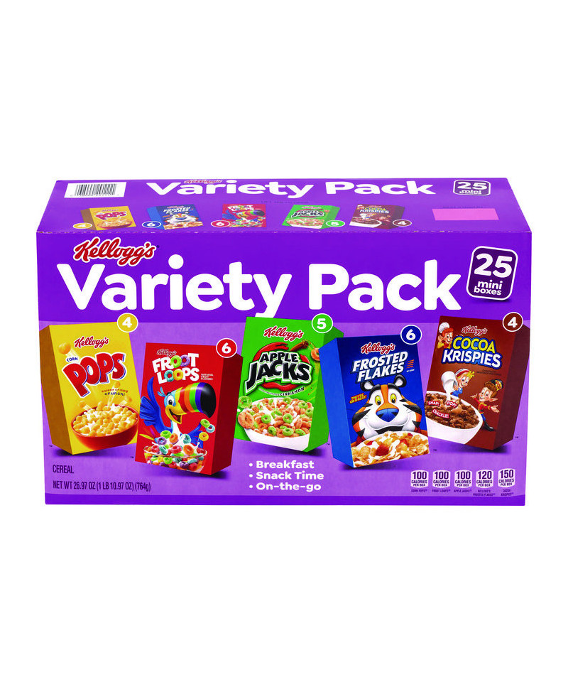 A sweet, crispy, crunchy way to start your day, Kellogg's Cereals make for a delicious cold breakfast any morning of the week. Featuring five tasty cereals, the Kellogg's Cereal Variety Pack is a good source of at least seven vitamins and minerals. Individually sized and conveniently packaged, these delicious cereals are an ideal companion for lunch boxes, after-school snacks, and busy, on-the-go moments. Just add your favorite dairy or nut-milk or enjoy as a crispy treat straight from the miniature box. This variety pack contains Corn Pops, Froot Loops, Apple Jacks, Frosted Flakes and Cocoa Krispies.