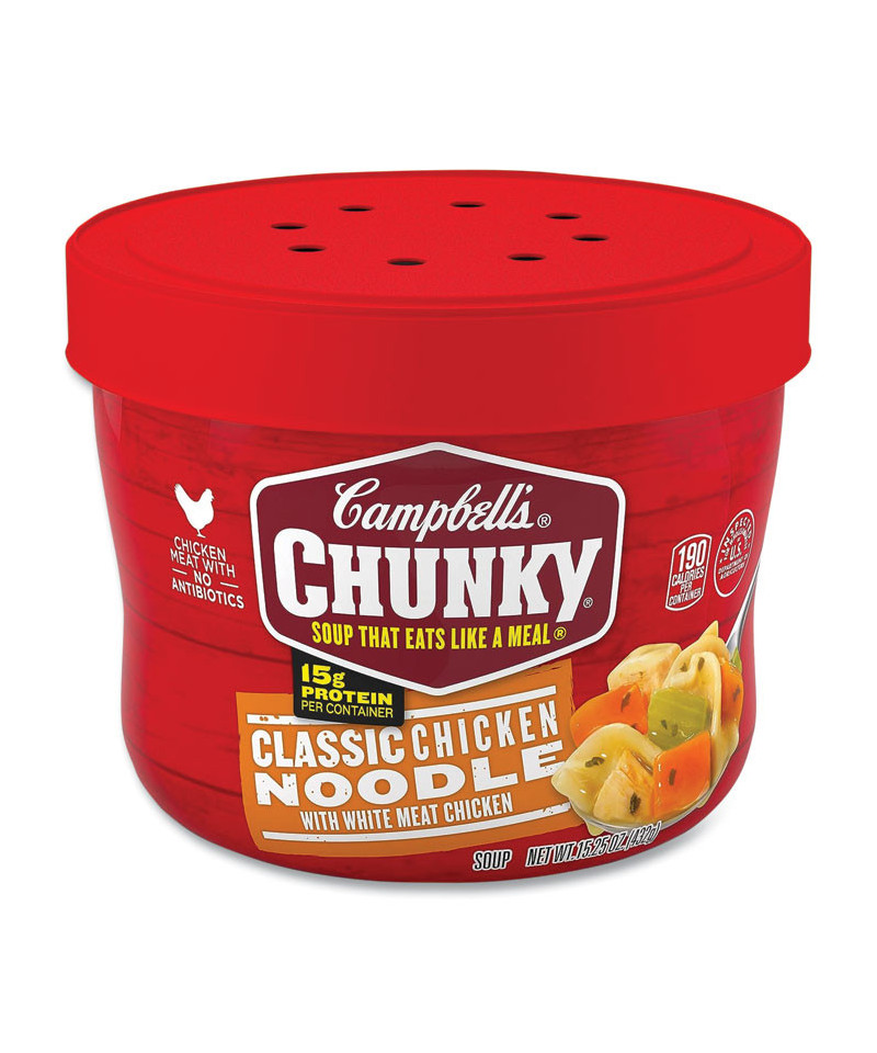 Campbell's Chunky Classic Chicken Noodle Soup isn't just tasty, it's made to work as hard as you do. With never-ending big flavors and bold ingredients, this comfort food classic is capable of fueling even the heartiest appetite. This ready-to-eat chicken soup is crafted with big pieces of chicken meat with no antibiotics, chunks of carrots and celery, and enriched egg noodles. Each bowl has 15 grams of protein. It Fills You Up Right. Packaged in a convenient microwaveable bowl, this soup requires no extra dishes to enjoy. Just open the ready to serve soup bowl and pop in the microwave when you're hungry and crunched for time.