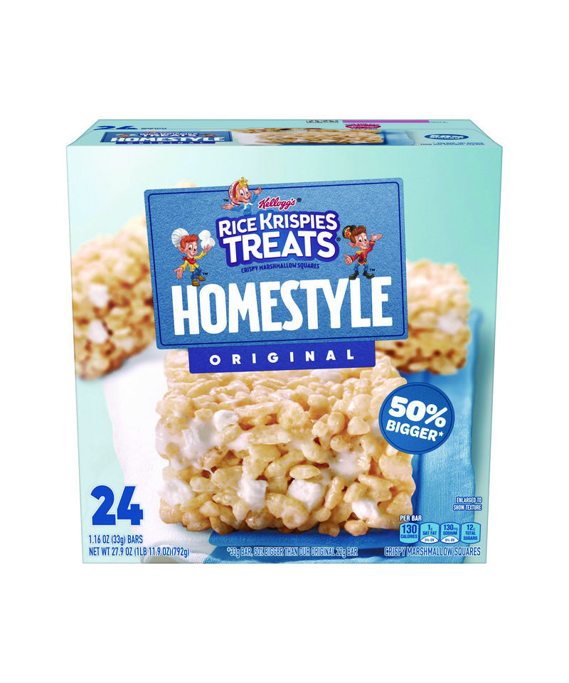 Snap, crackle, and pop invite you to discover a new take on a classic with Kellogg's Rice Krispies Treats Homestyle Original crispy marshmallow square. They have taken puffed rice cereal and folded extra marshmallows into this thickest, gooiest homestyle recipe. The individually wrapped marshmallow bar is perfect for snacks at school, the office, car rides, lunchtime, TV time and more. Take this deliciously convenient, ready-to-eat treat wherever you and your family travel. Unwrap the simple goodness of Kellogg's Rice Krispies Treats Homestyle Original and feed your sweet cravings day or night.